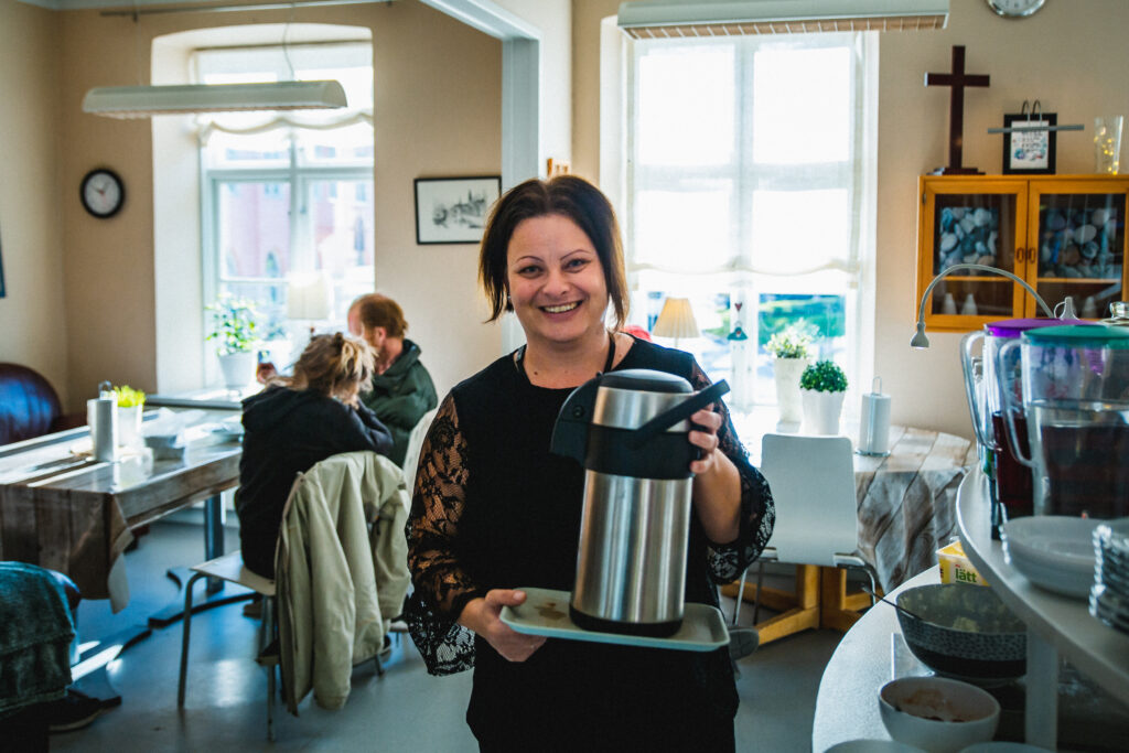 När man kommer till oss önskar vi att alla ska bli sedda, att man ska kunna känna en värme och hemkänsla. Att man blir bemött med värdighet. Vi önskar skapa en trygg miljö som främjar gemenskap och tillit, eftersom detta ofta är en stor bristvara i våra gästers liv.