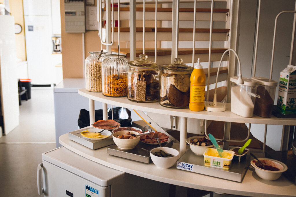 Grottan bjuder på frukostbuffé. I vissa mån delar vi också ut matlådor och hygienartiklar.